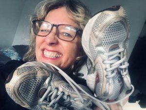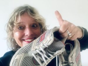 Dan gestommel op de gang. Mijn deur gaat open. Dochter steekt haar hoofd om de hoek van mijn kamer en vraagt of het zachter kan. Ze heeft online-practicum van de uni. Verstoord kijk ik haar aan. Dan zie ik haar blik. Die gaat van mijn verhitte hoofd, langs mijn blouse naar beneden. ‘Mam, serieus….’, fluistert ze. Ik gebaar met een subtiele handbeweging dat ze weg moet gaan. Inmiddels zijn de negen studenten op het beeldscherm super geïnteresseerd. Maar mijn dochter sist nogmaals, terwijl ze nadrukkelijk naar mijn onderdanen wijst: ‘Mam, die joggingbroek en… je glittersloffen!’