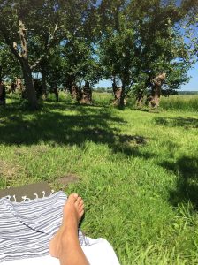 Als ik bezweet bij de boomgaard aankom, zit iedereen al met de handen voor de borstkas gevouwen onder de bomen. Ze zijn al begonnen. Ik zigzag -met anderhalve meter afstand- tussen de deelnemers door. Net als ik wil neerploffen, besef ik dat geen matje heb gepakt. Ik zigzag al tip-toe’end terug, pak een matje en ontsmet het vluchtig. Dan neem ik plaats op de eerste de beste plek achteraan. Ik vouw mijn benen in de kleermakerszit en veins rust.